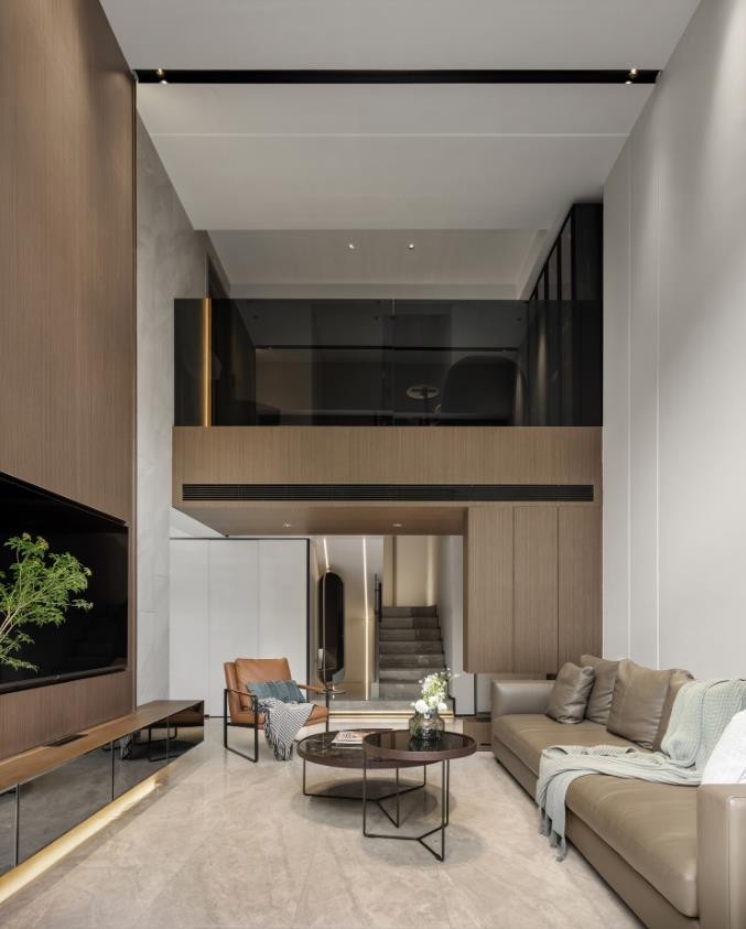 大理石台阶配上钢化玻璃扶手,线性灯加以辅助,彰显现代时尚的调性