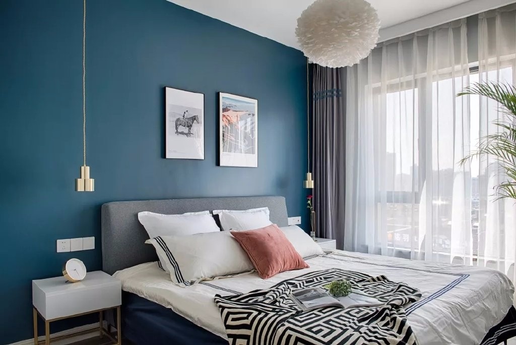 卧室的背景墙采用了蓝灰色,视觉有一种延伸,整个空间更活泼
