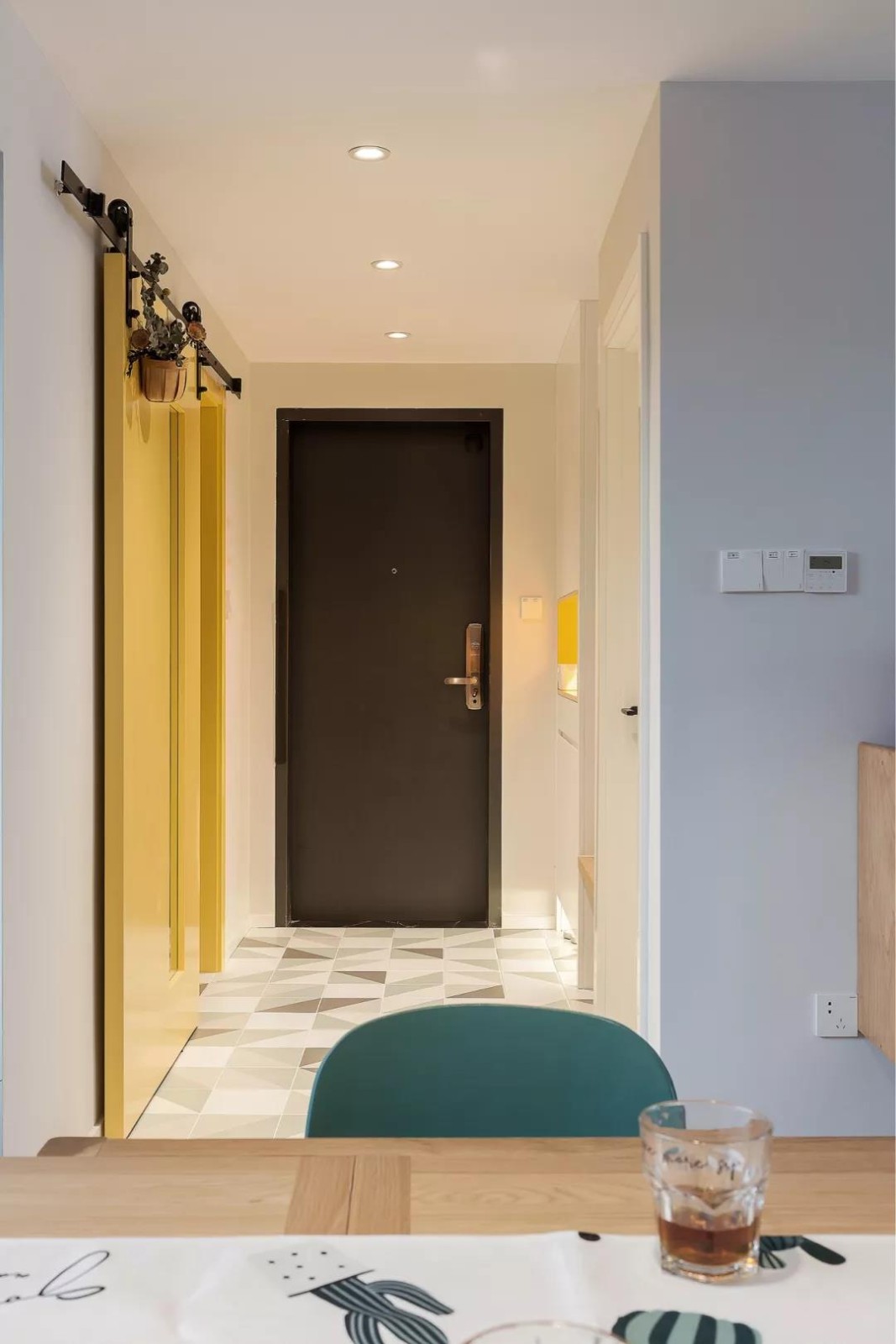 入户玄关是一个小走廊的形式,地面铺上黑白青色的花砖,搭配黑色的入户门,左边是一个黄色的谷仓门,右边是入墙式的玄关柜,空间留空的设计,让整个空间显得文艺精致且很实用。