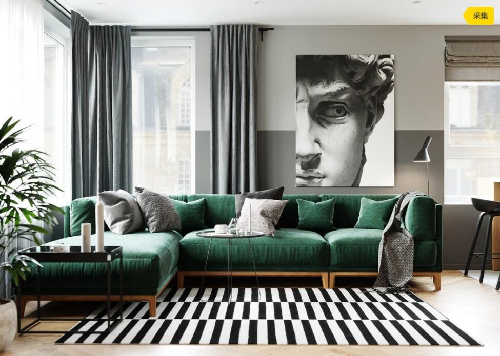 客厅以优雅的翡翠色沙发为中心,在中性色调的围绕之下,它是如此吸引着人们的眼球。