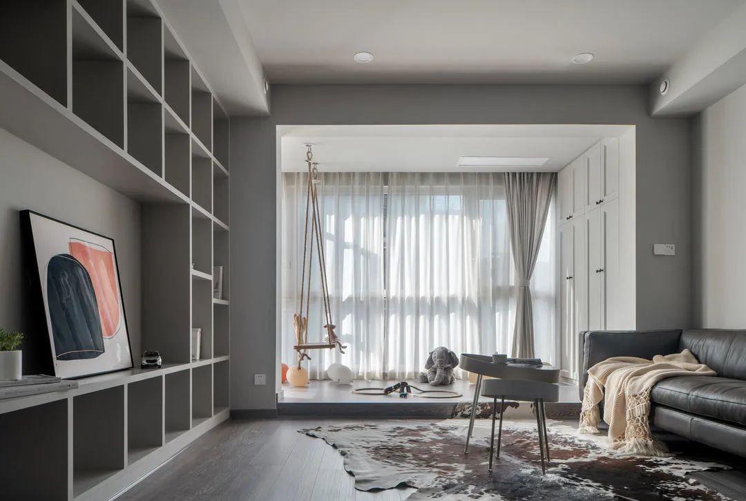 客厅比较简洁主要以灰色为主,无主灯设计,搭配深咖色沙发让空间有层次感。 电视墙做了满墙开放格,刚好解决空间储物难题,同时也有装饰作用。