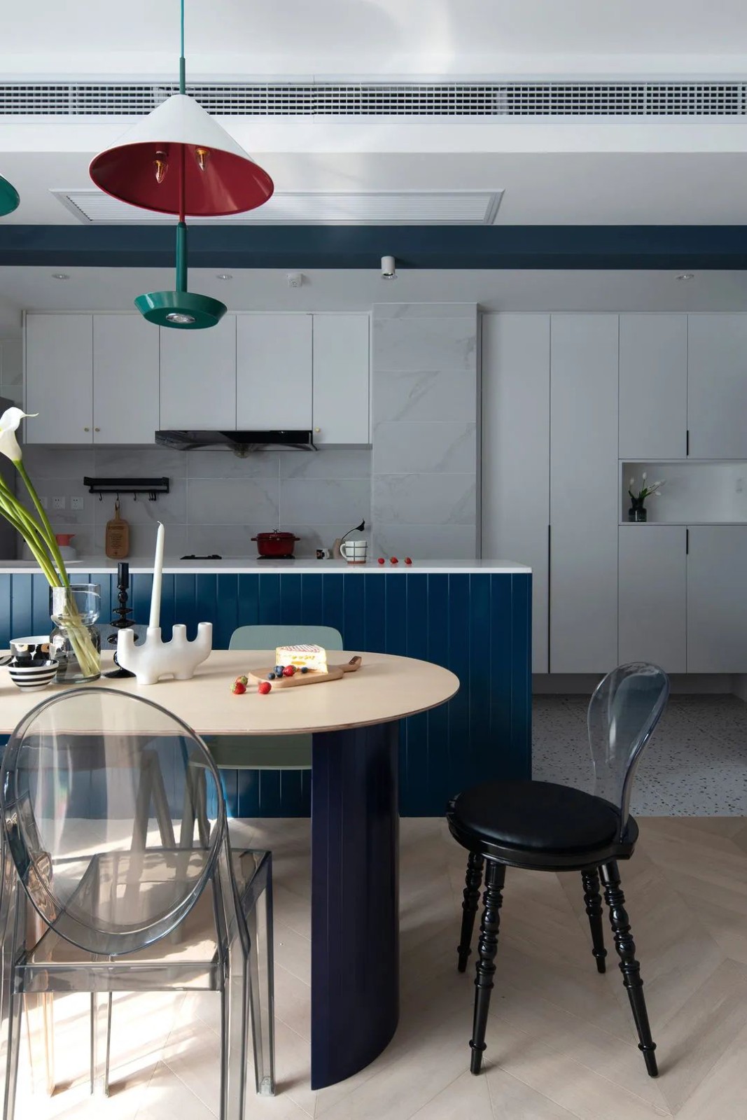 餐厅与开放式厨房相连,视觉上更为开阔。餐桌的选择,在色系上与整个空间呼应,椭圆形的桌面也更时尚。