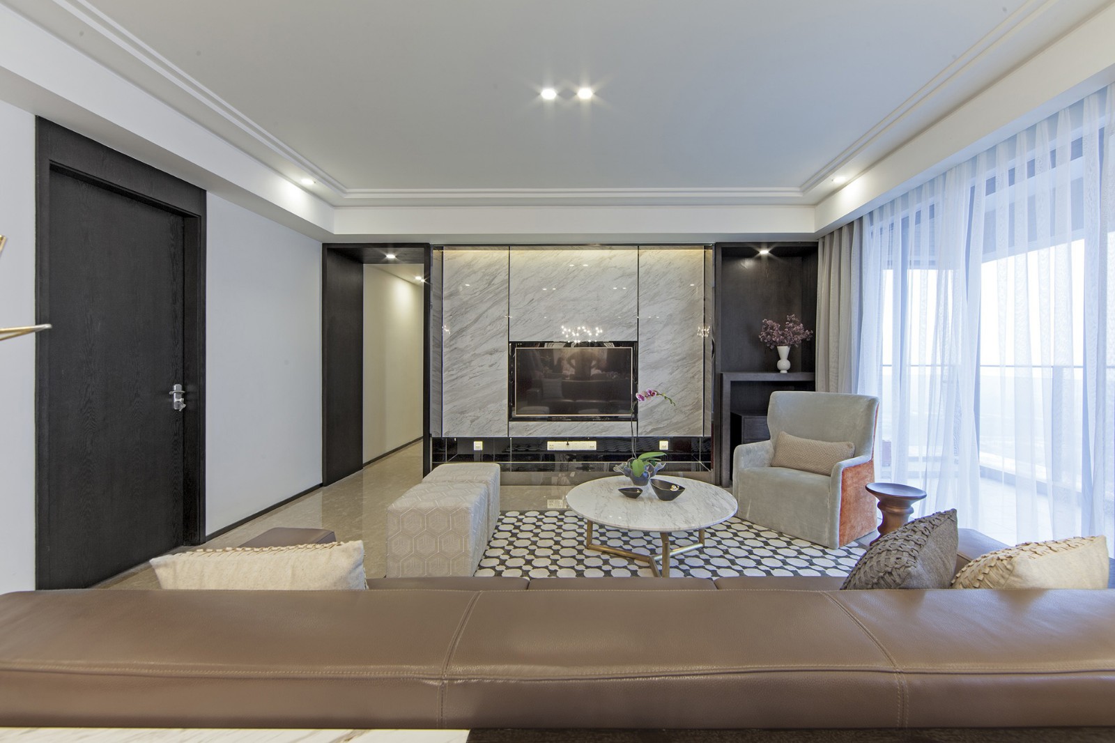 客厅,餐厅,厨房横向一字排列,动线简单明了,视觉更为开阔 ,色彩、材质元素融入整个家居空间,更加具有整体感