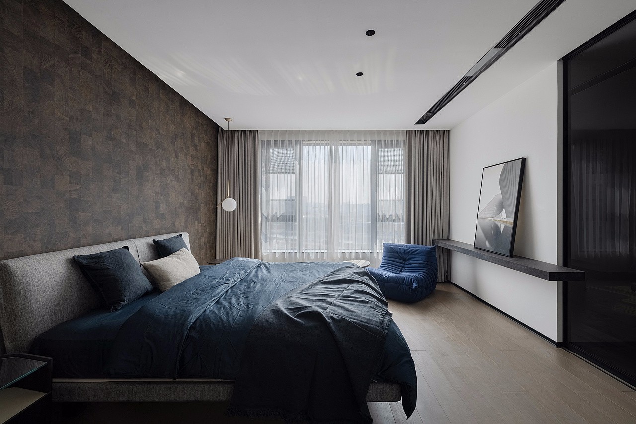 主卧室色彩和材质延续了客厅的调性,功能分布清晰井然有序。
