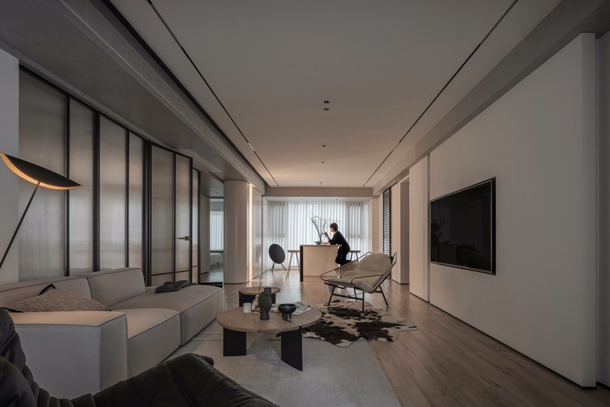 客厅是慵懒松弛的状态,无主灯的设计和处理得非常克制的电视背景,使得空间的压力再度减轻。