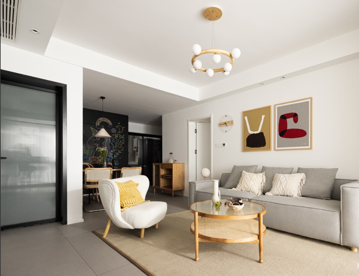 客厅的色调设计师的主题就是:白+灰+木色,白色墙顶面和灰色地面确定大基调,并且拉出空间的层次感,同时家具原木色的植入,让空间更加温润,富有温馨的质感。