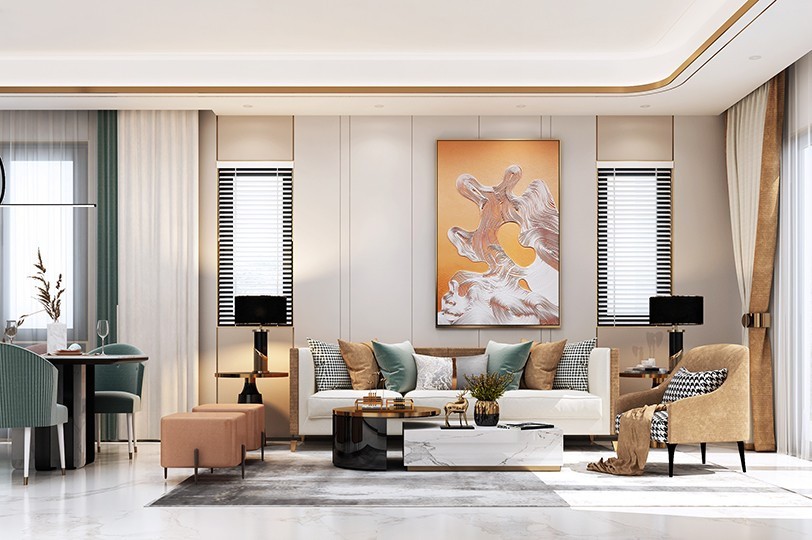 沙发背景墙配以素色硬包,橙色单椅加米黄色的窗帘 ,在阴天也温暖明亮,足以舒缓***的疲惫。