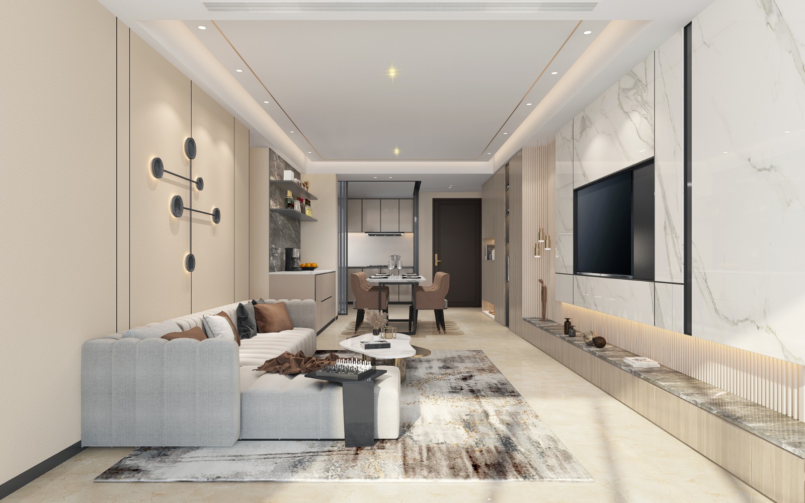 业主一家4口,喜欢现代风格,业主要求通透一点,厨房可以做半开式厨房。但是也需要一定的储物功能。
