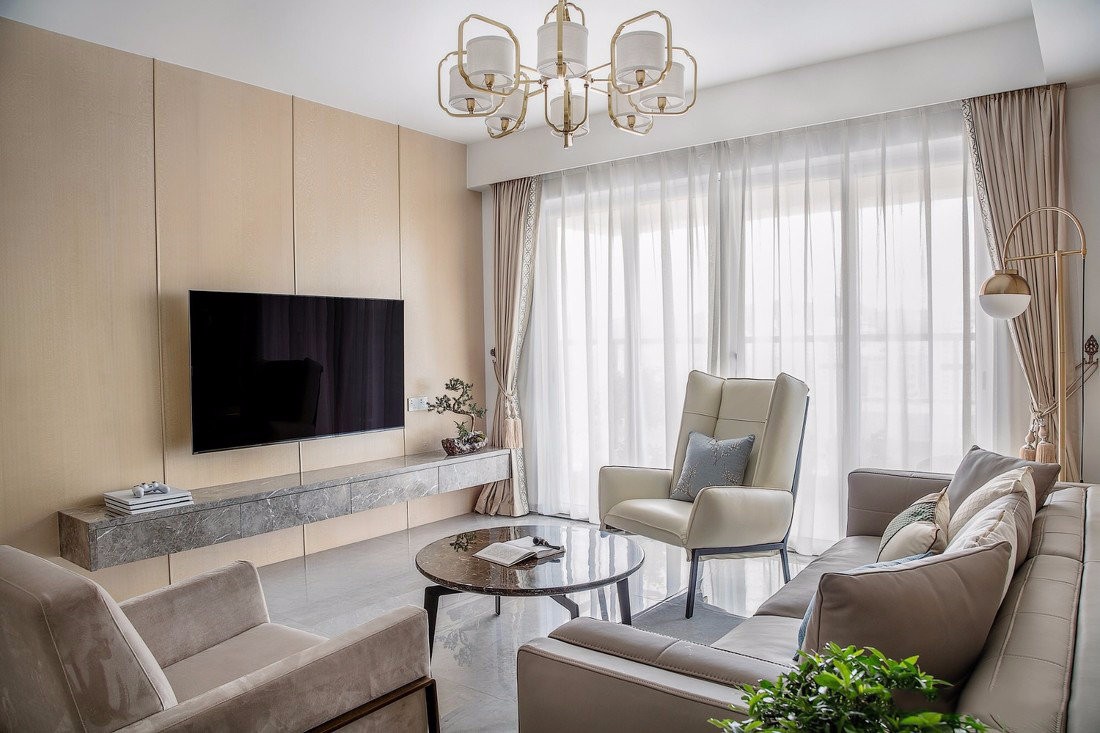 电视墙的暖色调木饰面对应着电视台大理石的灰,在这个家的冷暖色调中做了平衡。