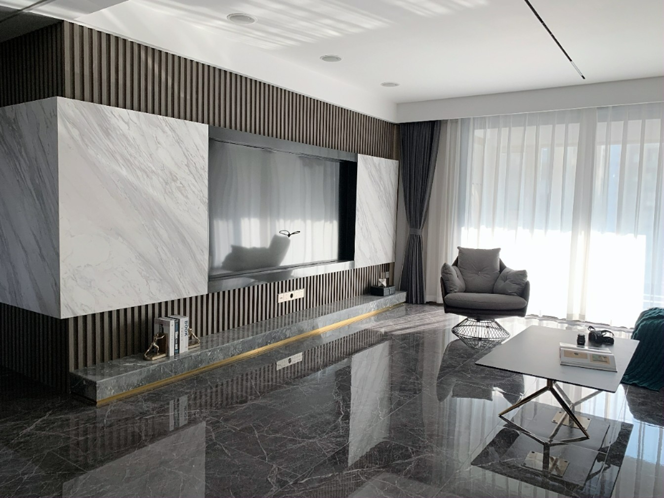 电视背景墙是现在很流行的木格栅加岩板,深色浅色对比以及材质的互相衬托,让背景更加的雅致