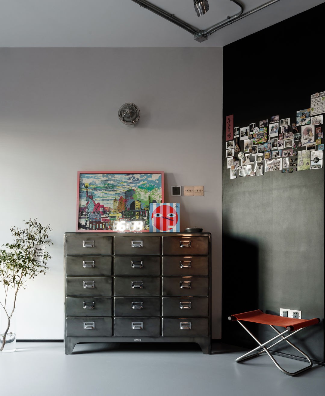 金属斗柜上方留了复古壁灯,在打开家门的瞬间就能感受到住宅的整体氛围。