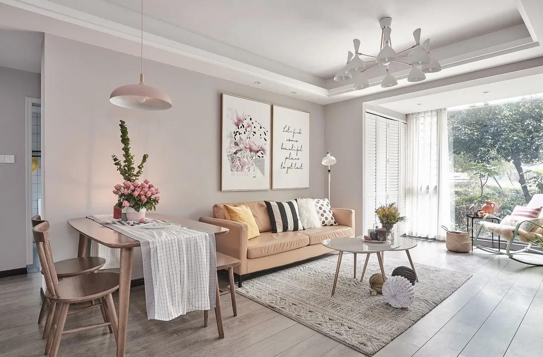 餐厅位于沙发一侧,原木餐桌搭配餐椅长凳,实用又节省空间。原本入户门正对卫生间门,因此将沙发墙延长,让空间格局变得更舒适。粉色的吊灯点缀,让简净素雅的空间更有爱。