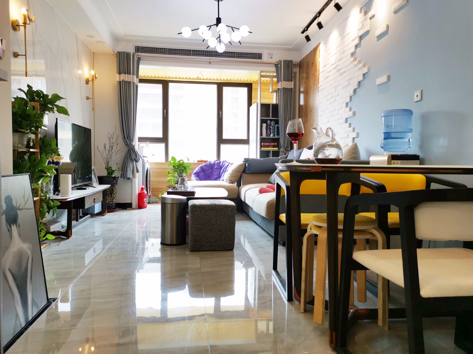 客厅:沙发背景墙选用砖墙与原木木饰面搭配,蓝色与白色对比,光线穿过纱窗,营造出朴质纯美的艺术光感和精致的生活氛围,简单而有序。