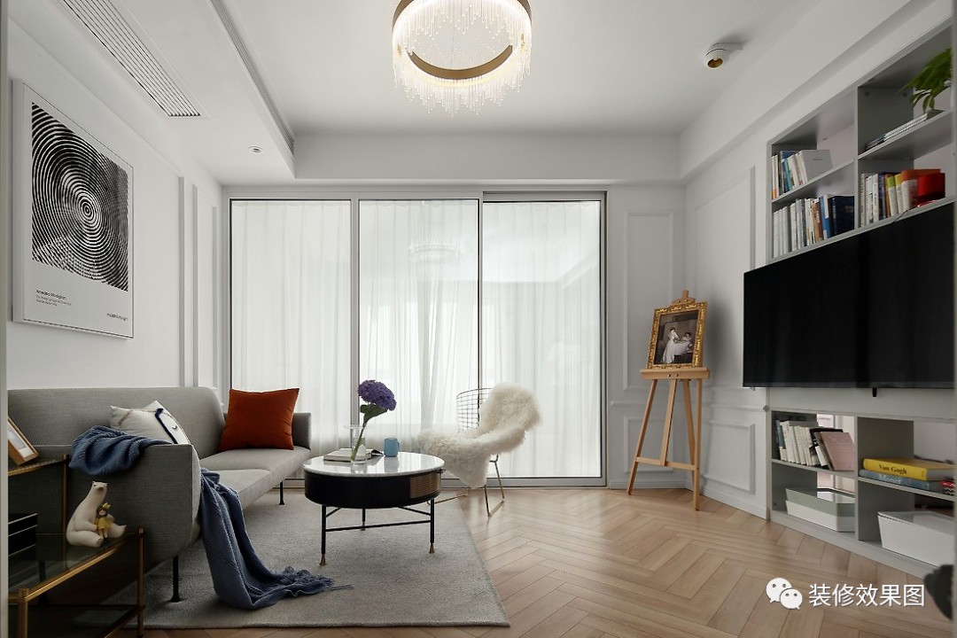 客厅重新划分后采用透明玻璃隔断分隔,不影响采光,一层白纱若影若现。人字拼地板给人温润且优雅的视觉效果,顶面的金色水晶吊灯凸显出精致质感。