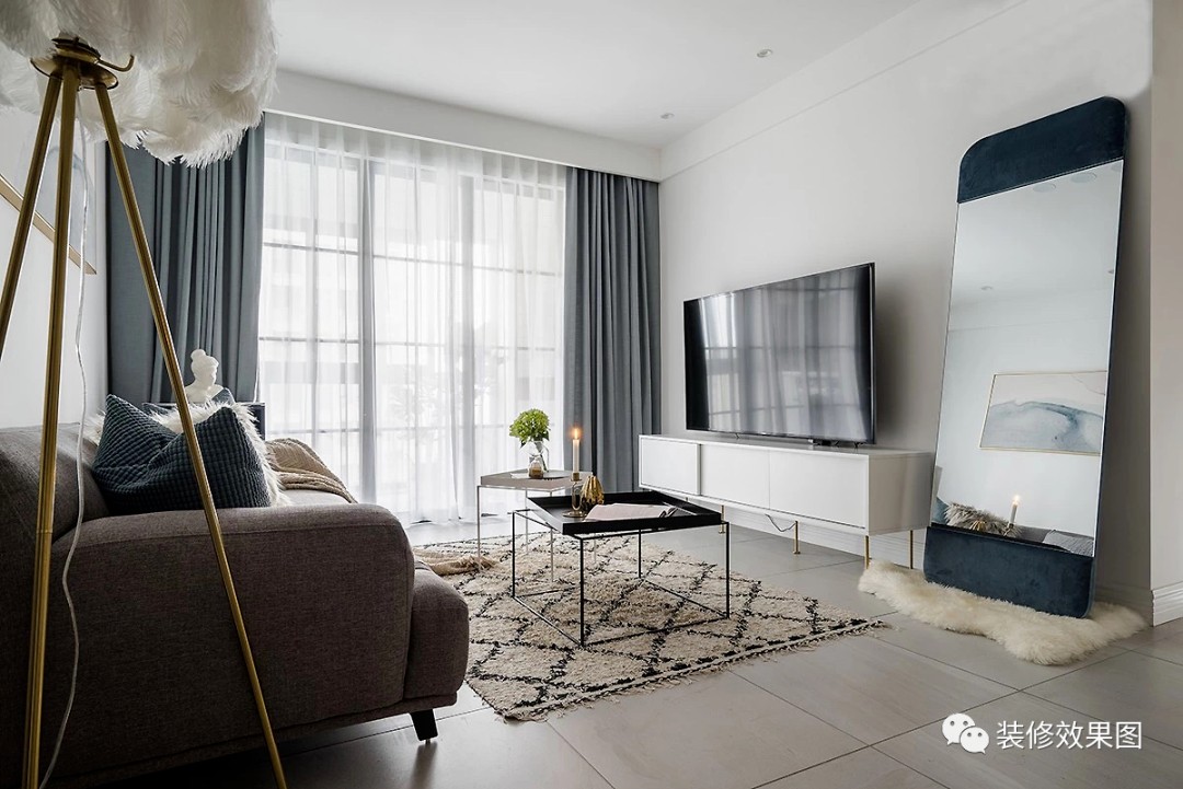 高颜值的长身镜、落地羽毛灯是男主人淘宝买的。沙发边几与长身镜,作为蓝色点缀饰品,实用与颜值兼备。