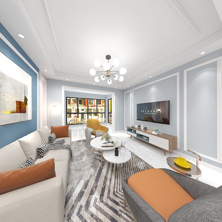 石膏线和乳胶漆构成一面简单的电视墙,造价低,沙发背景墙刷深色乳胶漆,突出效果,简单实用美观。