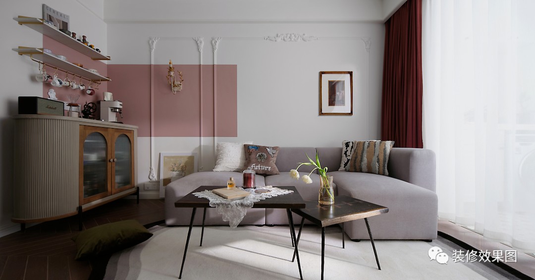 清雅的灰色沙发温和耐看、简约时尚,木制与铁艺搭配的组合茶几,一大一小,错落有致,带来满满的精致感。
