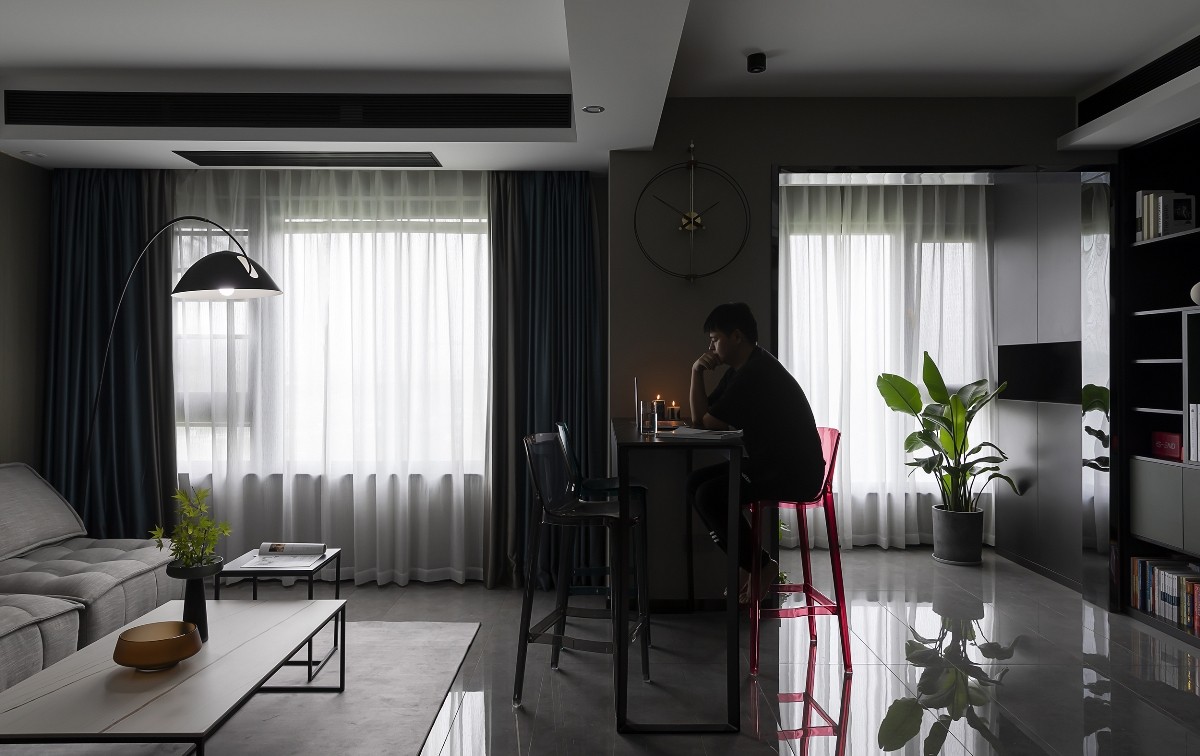位于四楼、五楼和露台,而且有两个大露台哦。160平方只保留了两个卧室。女主有着自己热爱的事业,男主是一位交警。他们都酷爱暗调且有趣的家,希望融入一些彩色进去,让空间变得有家的味道,塑造一个有灵魂的家。三口之家,储物空间需要,但不需要特别多。