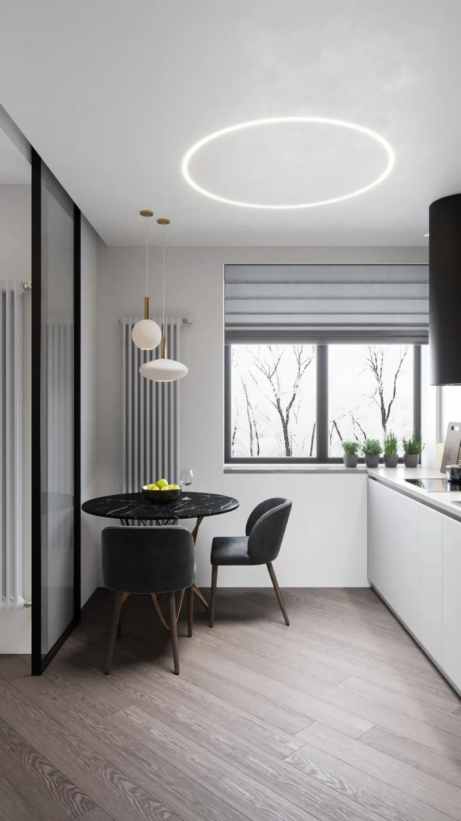 按照人体工程学形成空间,并为舒适的生活创造了条件。客厅通过滑动隔板与走廊隔开,当隔断关闭时,该空间将变成私人空间并完全隔离,当打开时,它可能会成为客厅的一部分。