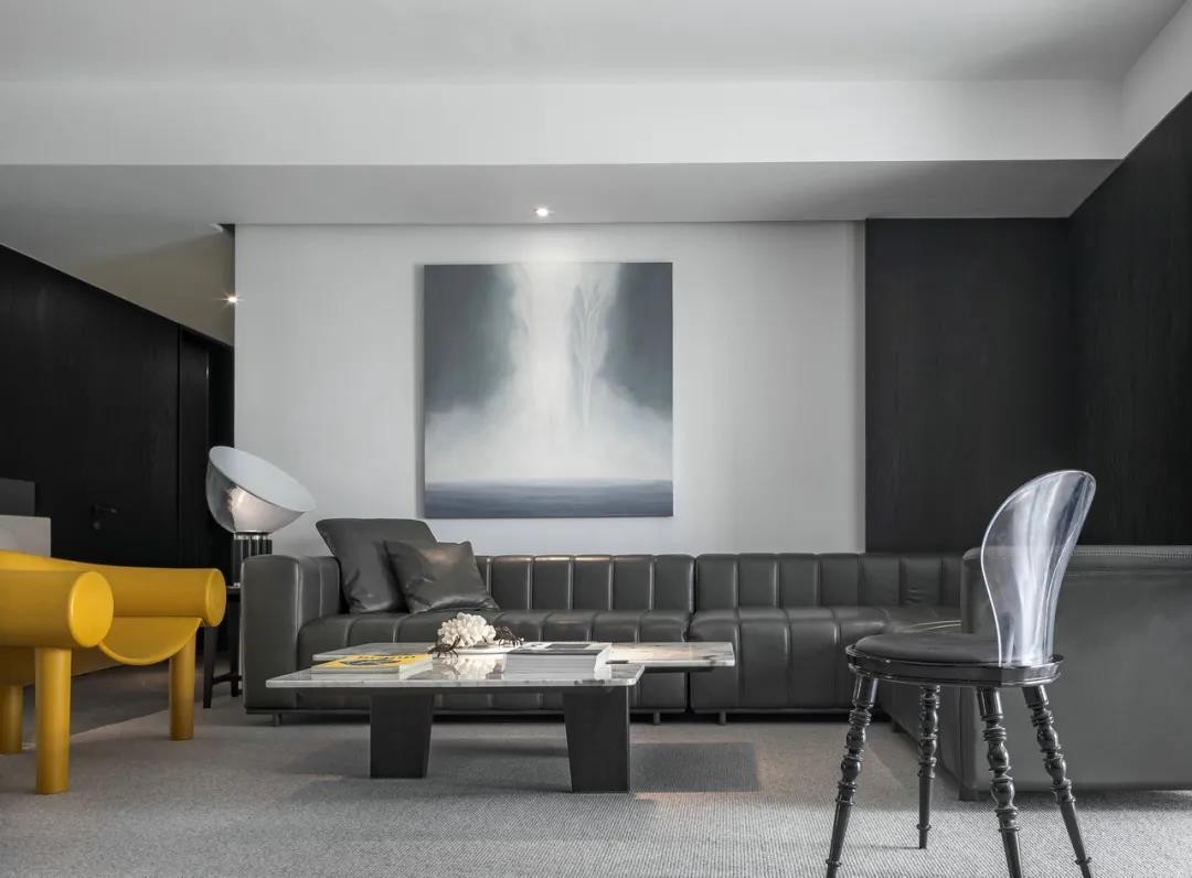 沙发墙右侧墙角两边加入黑色护墙板,中间挂一幅灰白色的的大尺寸装饰画,搭配深灰色的皮沙发,还有大理石质感的茶几,也让空间显得更加优雅华丽。黄色的休闲沙发椅摆在空间里,也点亮了***灰空间的生机感。