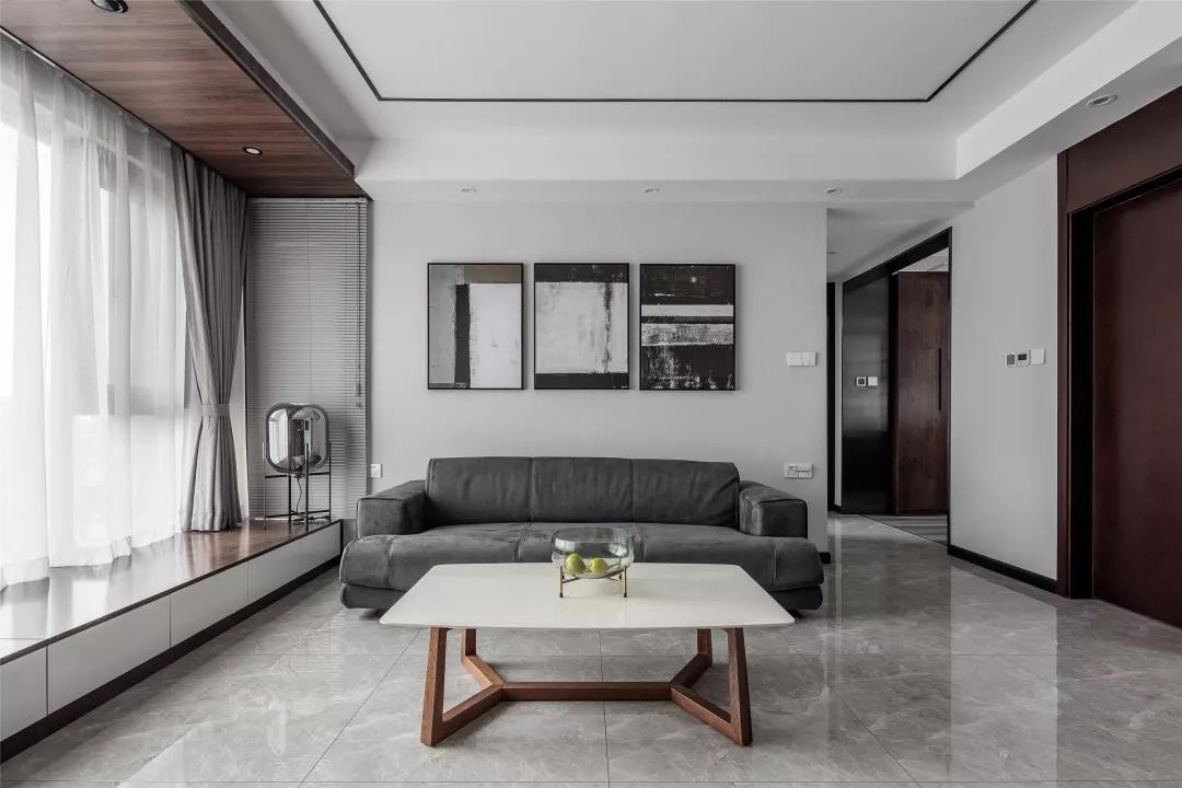 整排的飘窗底部都是柜子,台面和上方的吊顶都做了深木色的,结合灰色调为主的墙面,让人感觉典雅稳重而又年轻大方,不老气也不会太单调。