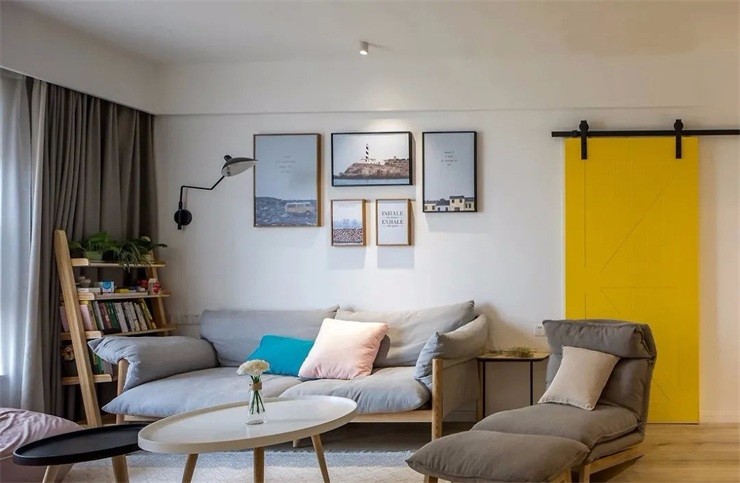黄色谷仓门十分抢眼推开后即是厨房既节约使用空间又增加了欢快愉悦的氛围。