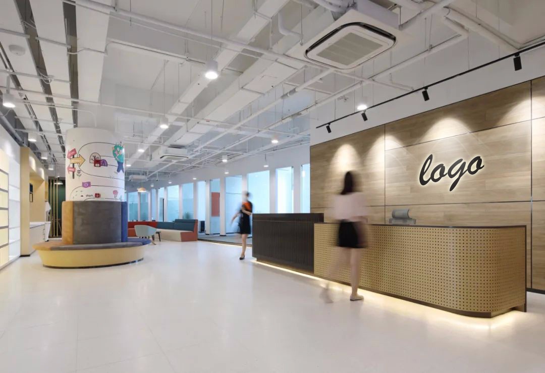 前厅是狭长型的功能复合型空间,设计师使用木饰面材料拼合成LOGO墙,前台搭配黑色和木色镶黑边穿孔板材质,营造开放,温馨的氛围。等候区丰富的卡通形象画和家具色彩,增加了空间的可读性,同时这些融入长投品牌属性的平面视觉,也转化成空间属性,活跃空间休闲舒适的生活氛围。