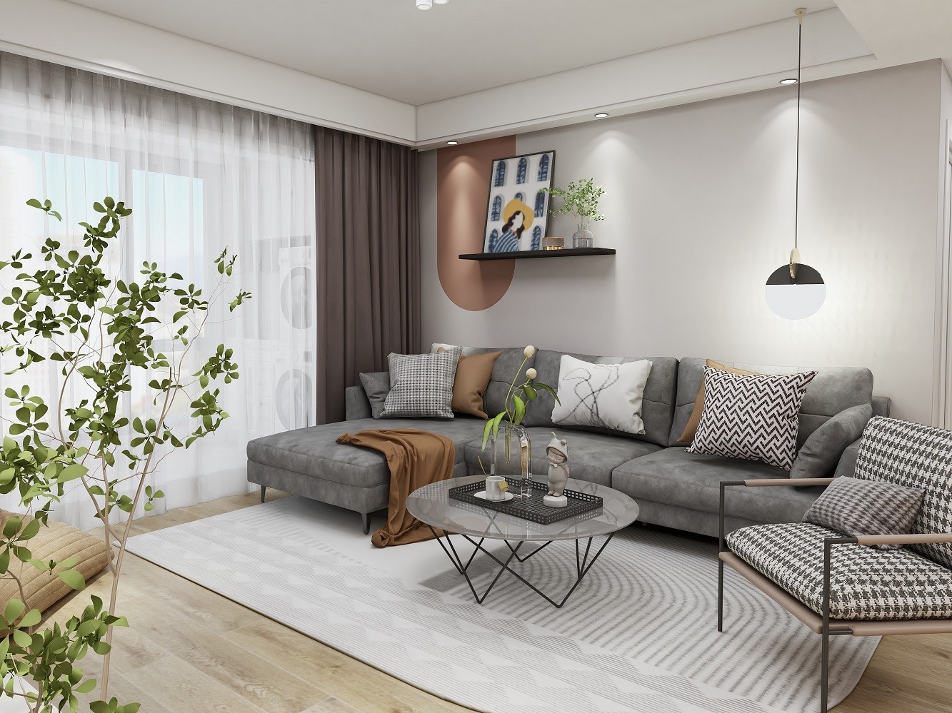 电视背景墙去掉了花哨,以简洁为主,配合绿植与电视柜书架,简约之下凸显秀之美