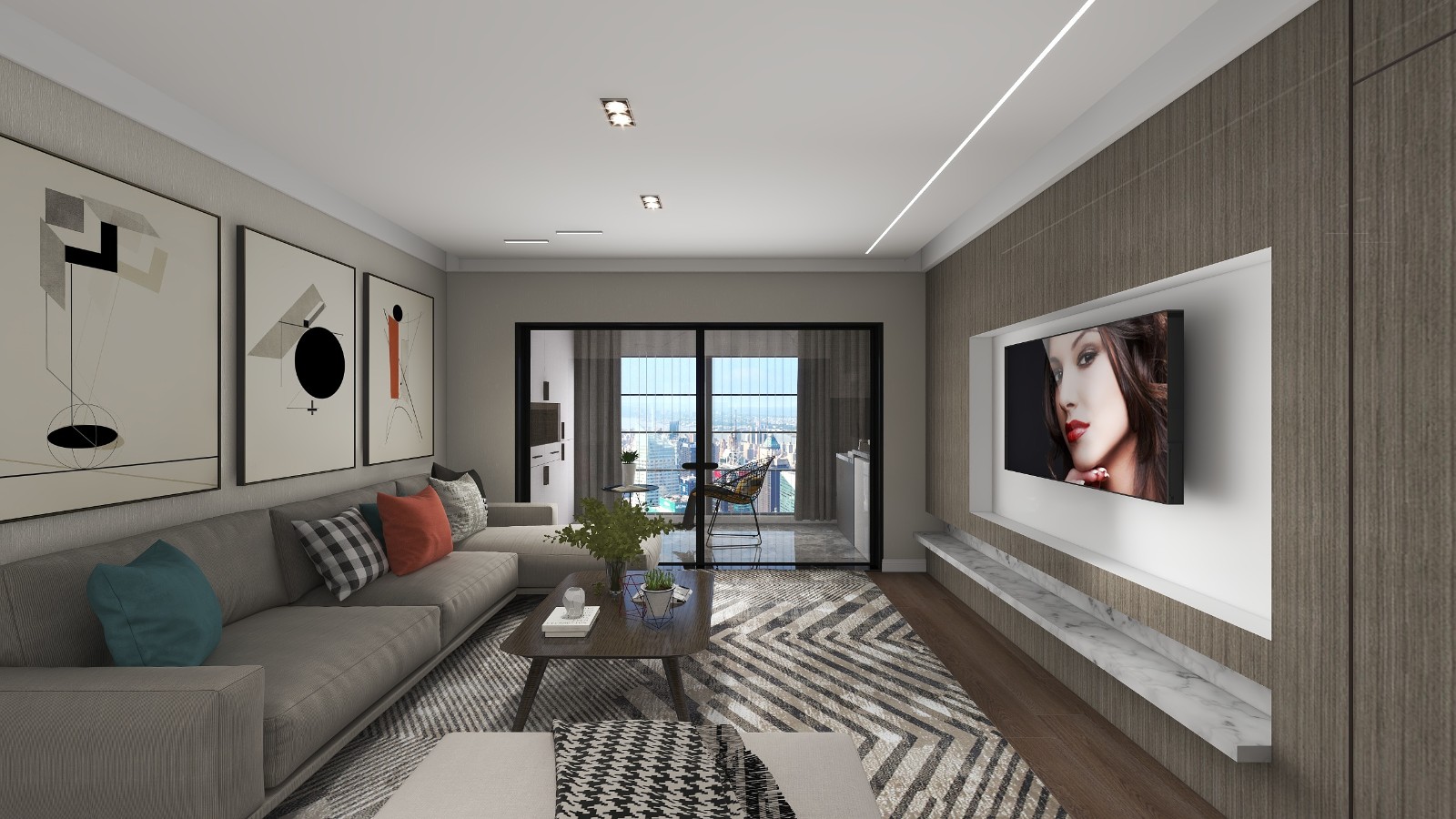 客厅后就是多功能房,在电视背景墙旁就有一个门,所以设计了隐形门与电视背景墙一体
