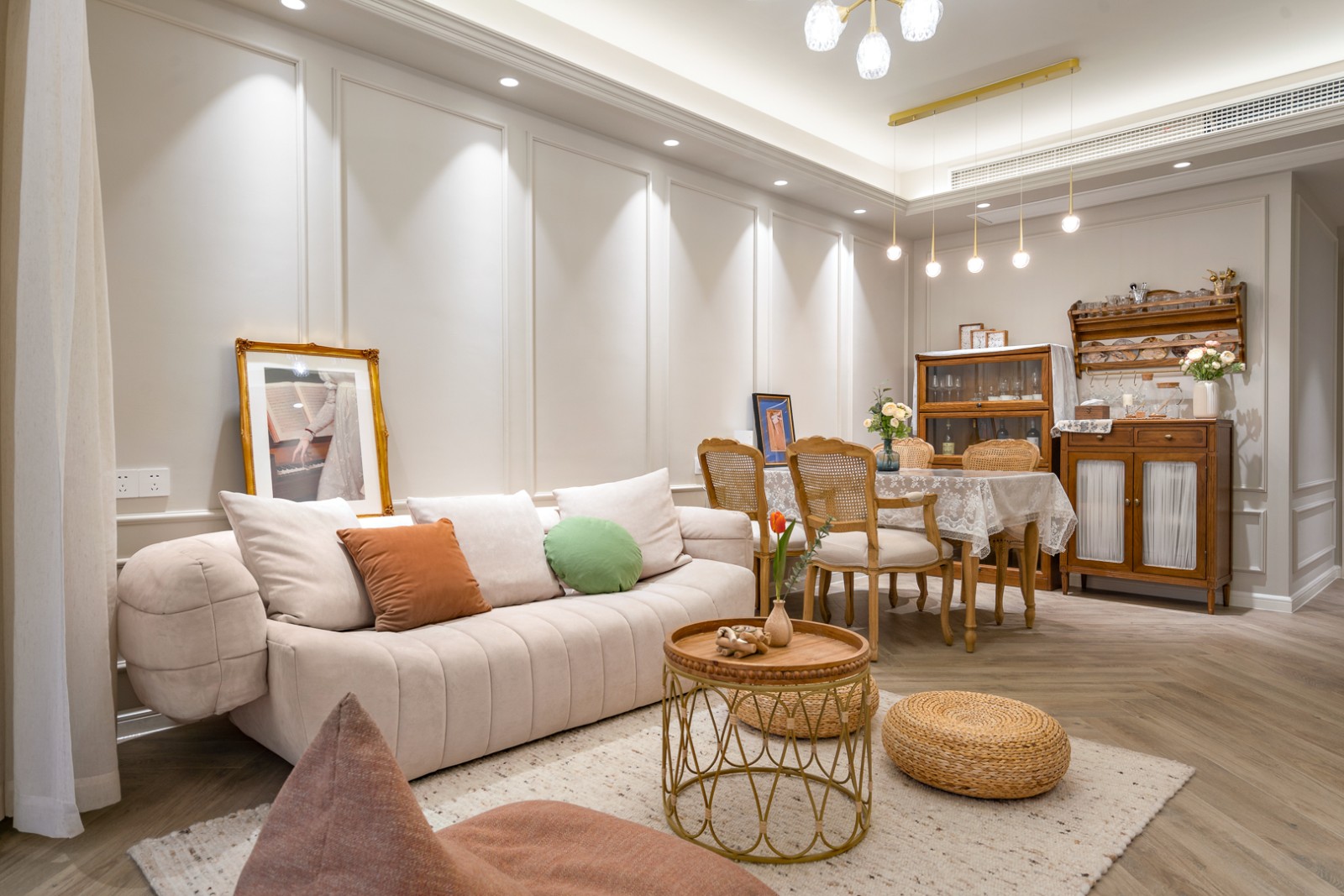 实木餐桌搭配藤木餐椅,在灯光下温雅治愈的气息呼之欲出。