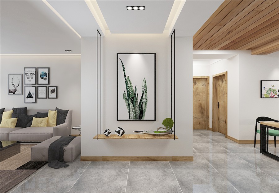 入户玄关,原始结构不是很方正,也不正,通过设计师的改造,餐厅方向嵌入了冰箱和书架,把浪费较多的走廊改到了正常尺寸,衣帽间也有所增加。铁艺+隔板,暗藏灯带,植物……极简无处不在