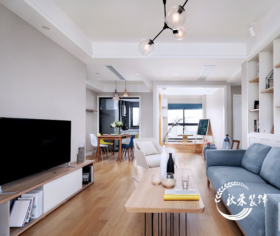 设计为北欧风格,特点轻装修重装饰,总体色彩搭配选用中性色,点缀色明度高。总体空间给人一种宁静、舒适感。