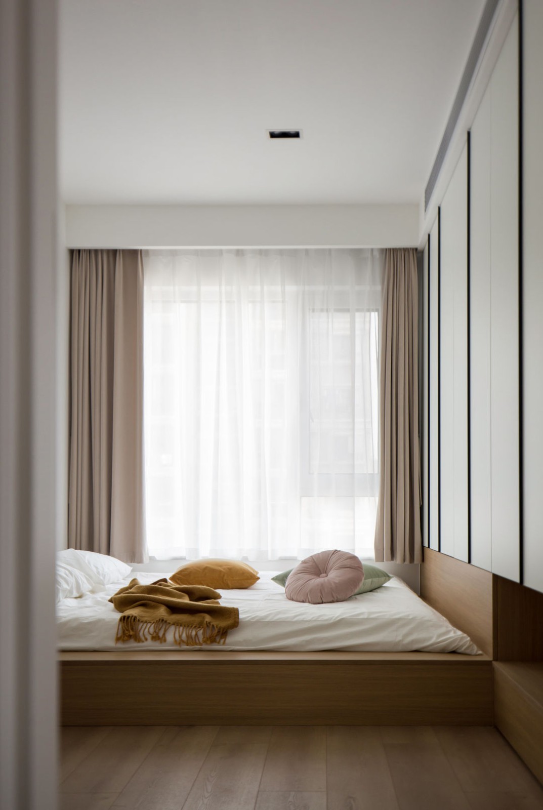 绒布的质感让整体氛围又提升了不少,使人触感上能感到舒适与温暖,引导人的心里感受。 主卧墙面用了橡木色的木饰面,来增加温馨感床头柜则是亚克力的材质,***而又有趣晚上拉上窗帘,通过顶部射灯跟台灯的辅助光源整体就很温暖。