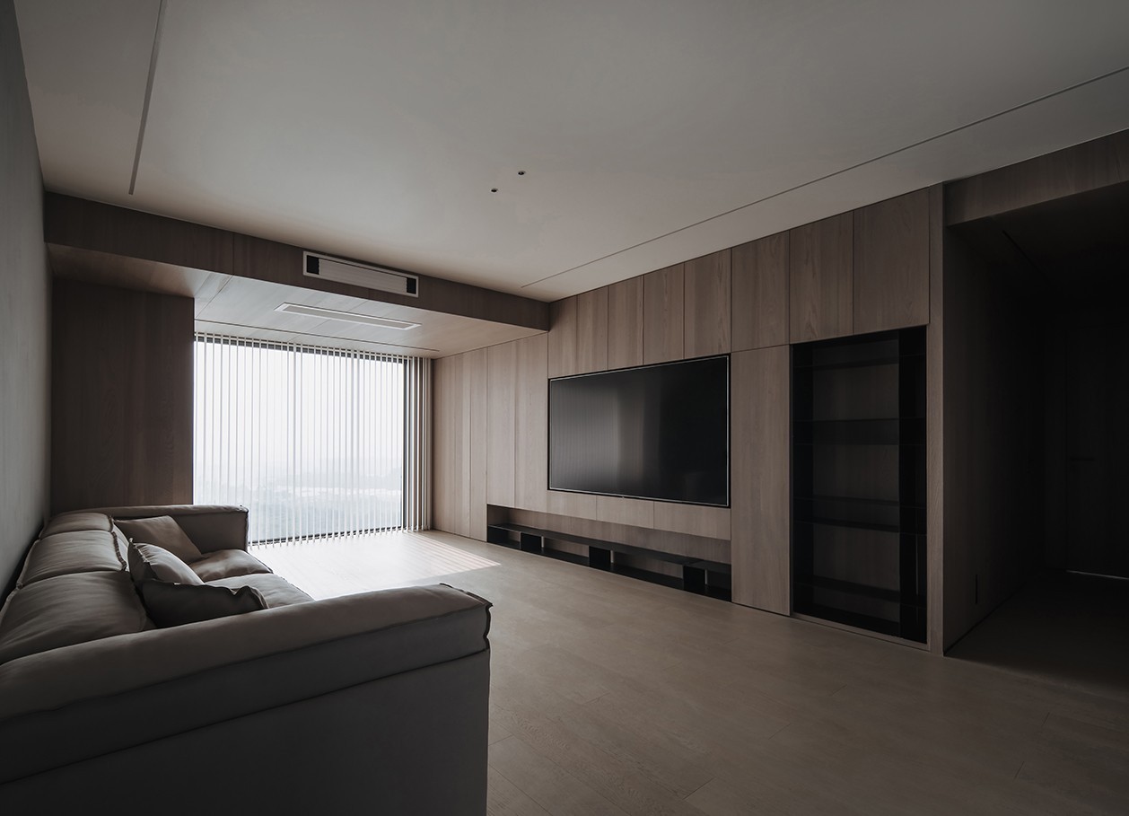 公共区整体格调采用暖色木纹饰面与暖色灰泥,营造了温馨舒适的居家氛围, 大面积的落地窗彰显空间的大气与尺度,可使原本压低的层高更加开阔,赋予空间轻松高雅的灵魂。