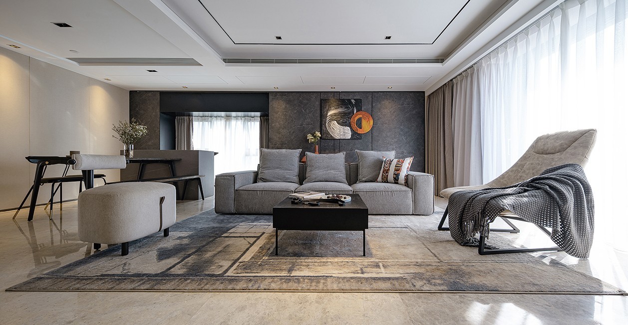 背景墙一面保留原有的暖米色硬包,另一面则换成了深色的木制石纹护墙板,搭配暖灰色布艺沙发、拼色抽象派地毯、深色木制家具等,流畅的线条比例与色块组合。
