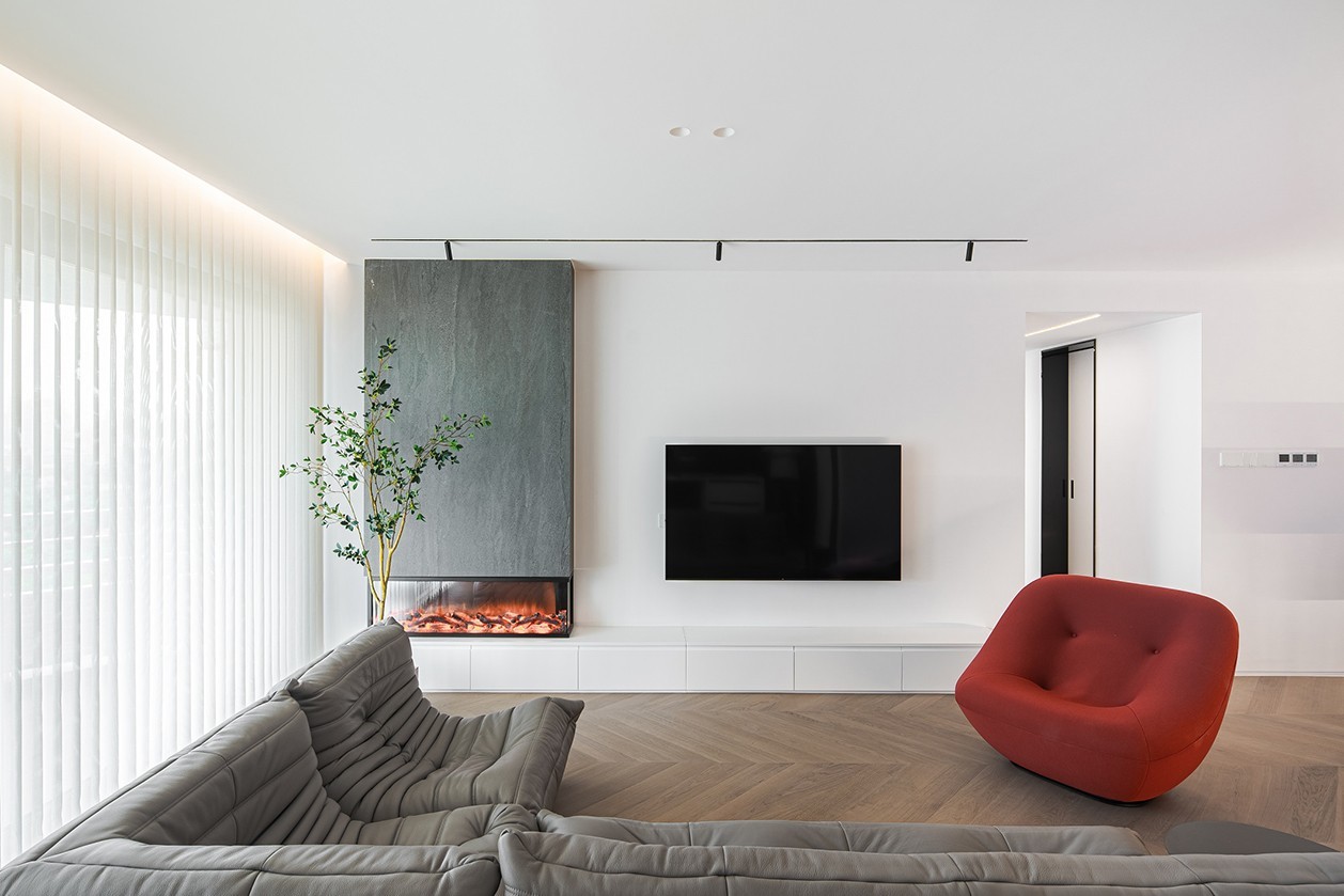 客厅没有选用传统的窗帘,而是更适合极简风格的竖百叶帘,能通过开合、调整百叶角度等方式调整光影效果。