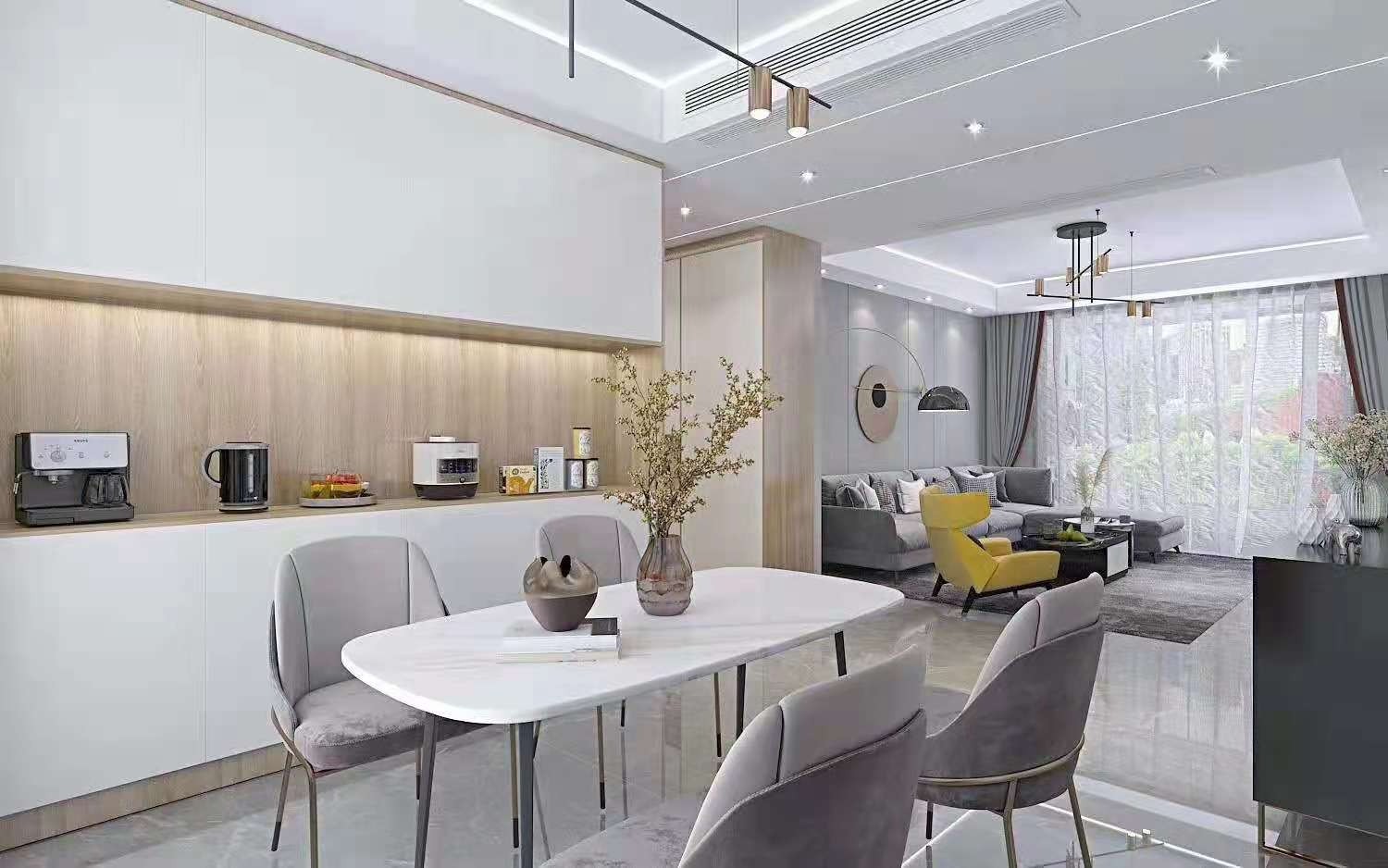 客厅整体色调以白色灰色为主,家具以原木色点缀