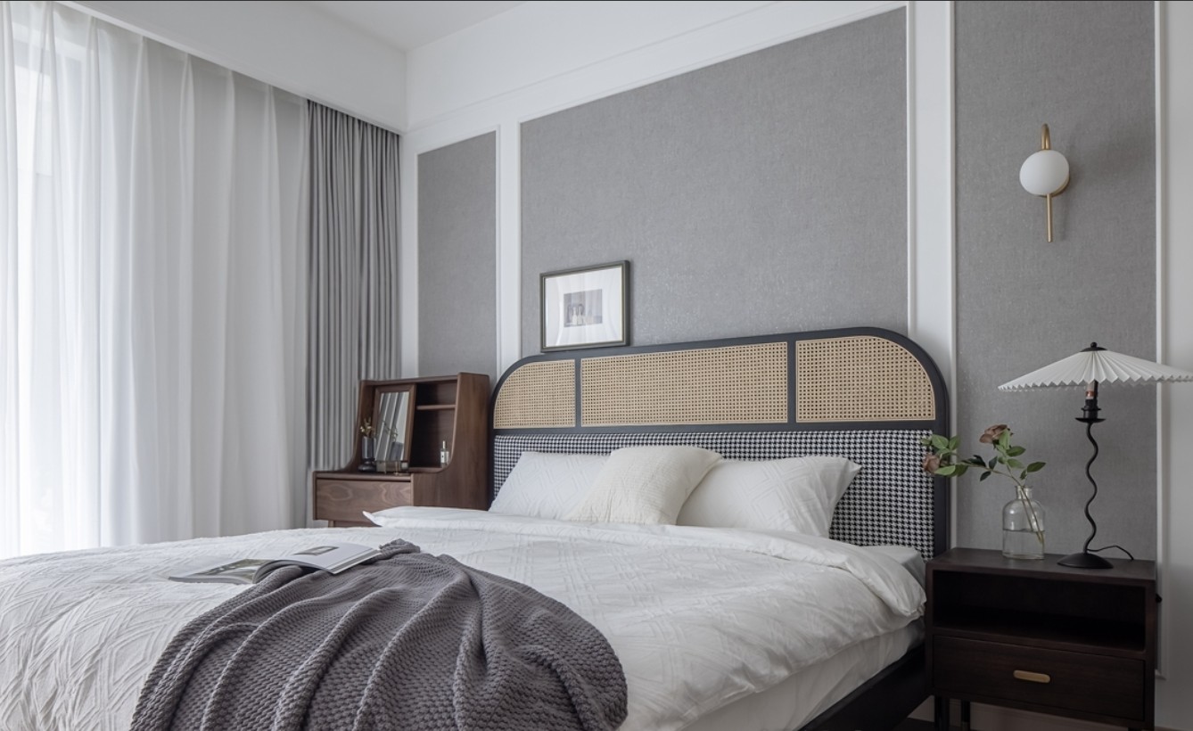 主卧选购了***千鸟格软包结合藤面的床,时髦与自然的融合,黑、白、木就像一件优雅的“小洋装”,搭配纯白的床品,打造复古雅致、自然惬意的小空间。