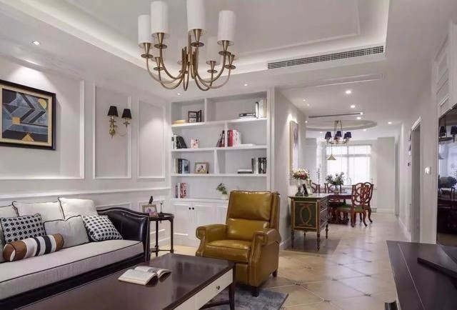 客厅和智能体线条明朗,空间划分明确,美式风格中常见的元素,如护墙板、石膏线也被大量的运用其中。复古地板的加入,实现了现代与复古的碰撞和融合。