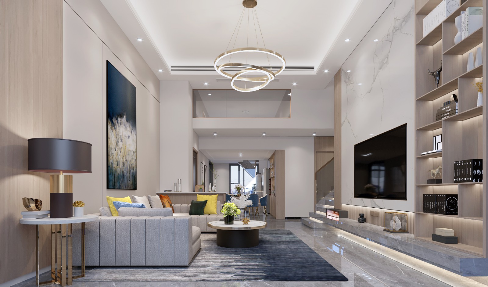 视背景就是客厅的主要装饰,它连接了一楼与二楼的主要视觉装饰,***的配色打造了高质感时尚空间