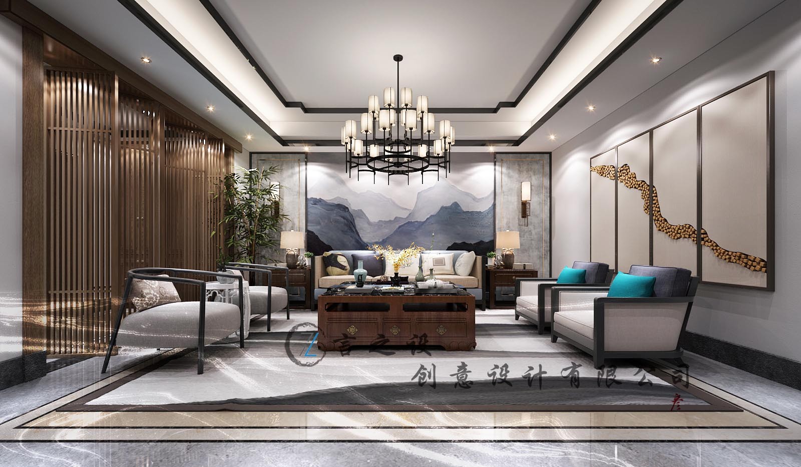吊顶采用木制格栅,和石膏板加灯带的做法,特意拉高了中间区域的层高,木格栅的使用使人在视觉上减少吊顶的落差,没有那么生硬,该区域使用起来也更加的舒适。
