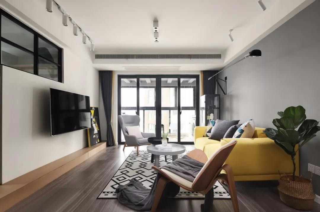 客厅冷灰色的墙面与暖黄色的沙发,形成了很好的视觉碰撞,生动而富有张力