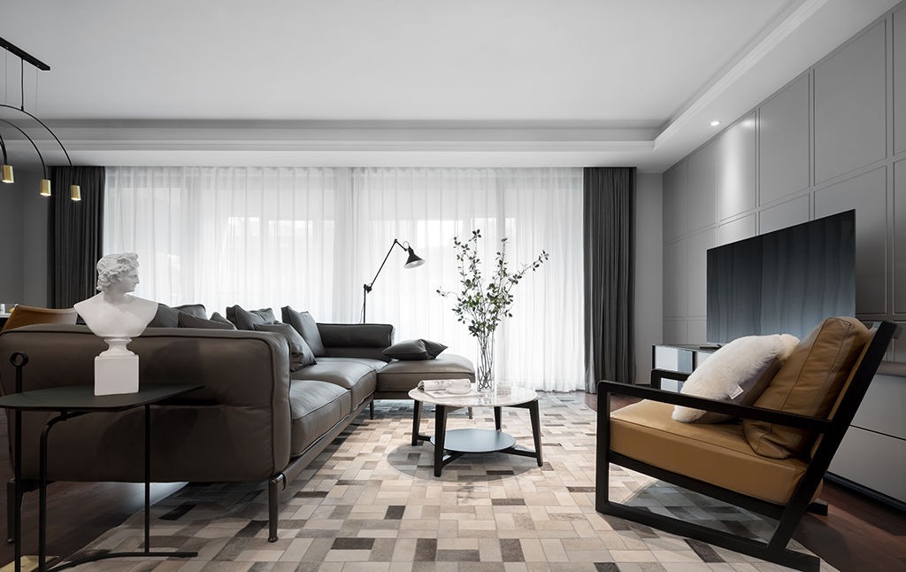 皮质沙发打造质感满满的现代空间,茶几、边几、地毯等利落的线条感与现代简约家居风格相得益彰,背景墙和窗帘以灰白色做搭配,整体空间呈现出一种洁净、冷淡的简约风。