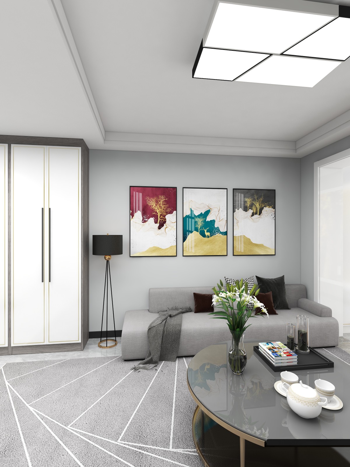 灰色布艺沙发,整体浅灰色墙面,一侧做通顶置物柜。