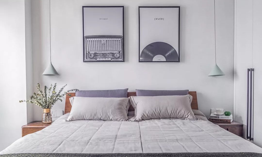 卧室的整体色彩还是以***灰为主,床两边的悬挂式阅读灯可以节省出摆放书籍的空间,衣柜的细长型把手可以拉长整个空间的视觉感受