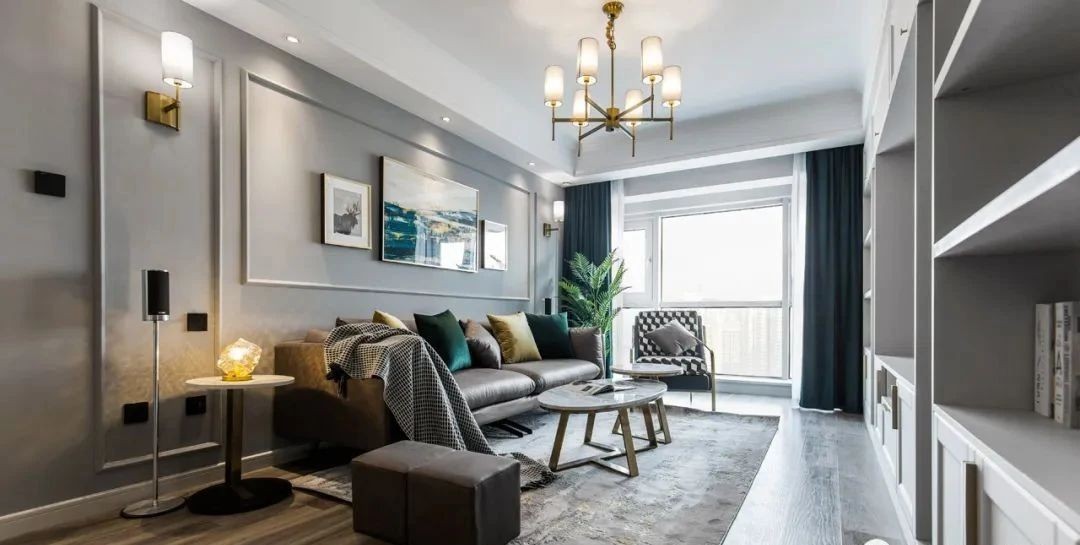 整个客厅大面积采用了灰色系,搭配绿色系的软装,既清爽又大气