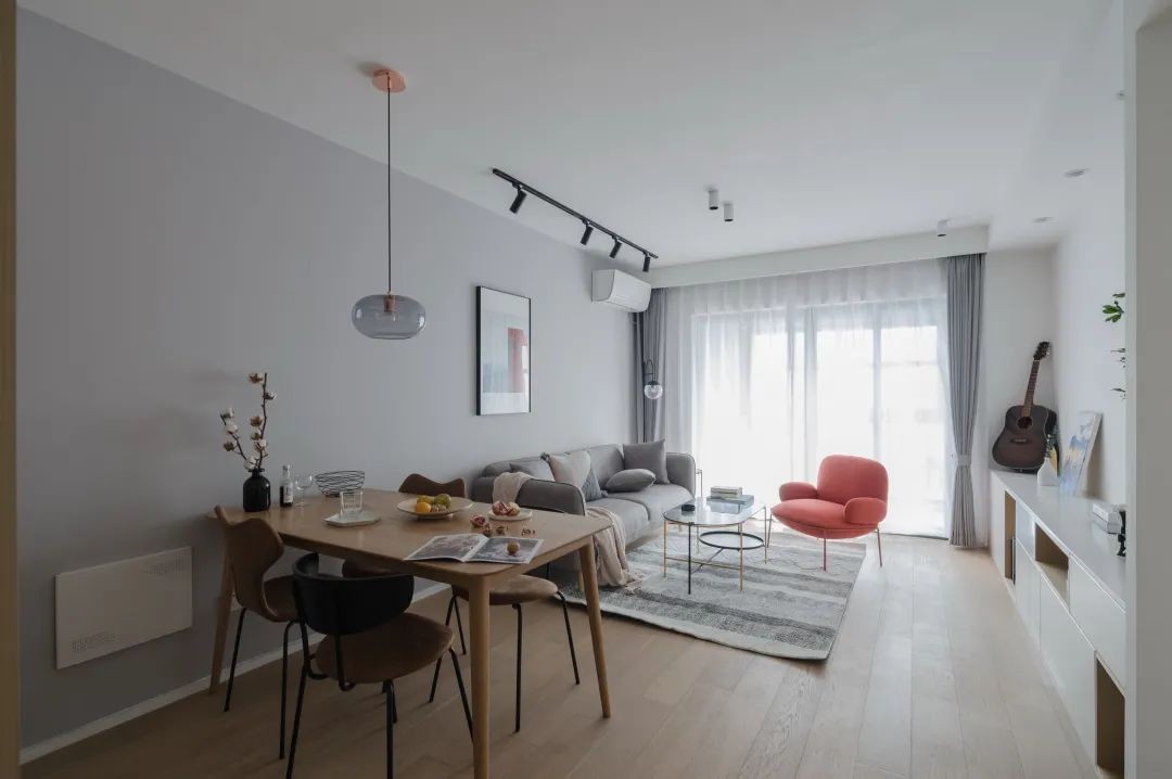 套内面积75平米的房子中,整体空间以实用与美观为设计,空间保持简约风的格调,在木色与白色的柜体搭配下,布置上灰色的简约质感家具,让空间充满轻松与舒适的气息。房子的厨房是没有窗户的暗厨,通过半开放式的设计,也让暗厨装出了***文艺的气质感。