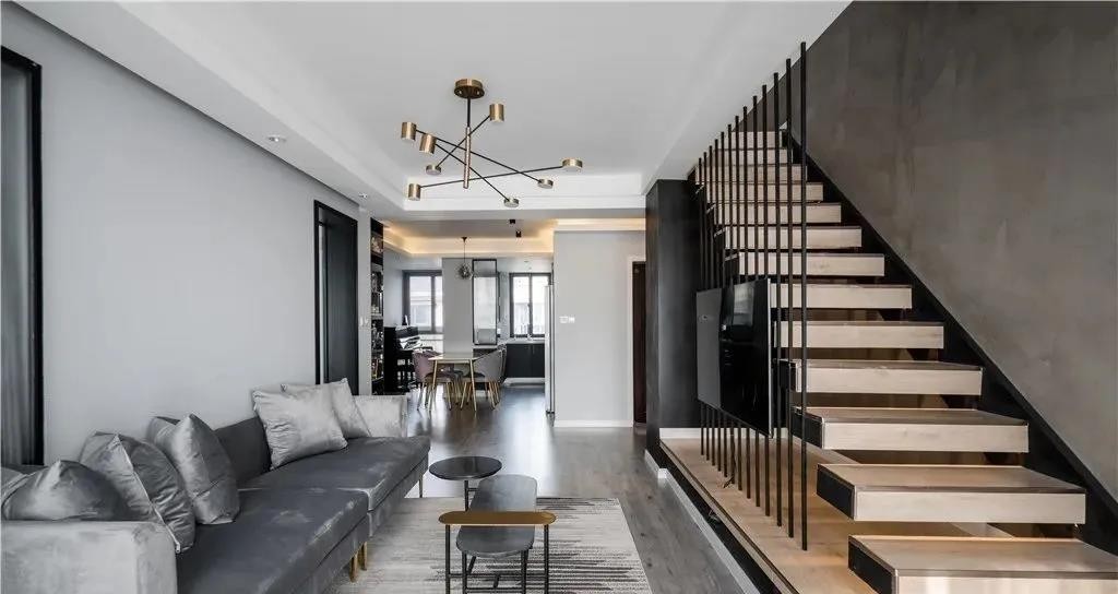 客厅,将楼梯移至电视墙处,墙面涂刷水泥艺术漆,打造黑色铁艺格栅悬挂电视,加上楼梯踏步下方的隐藏灯带,简约时尚,***感十足。打通阳台包进客厅,并打造了地台,作为休息放松的空间。