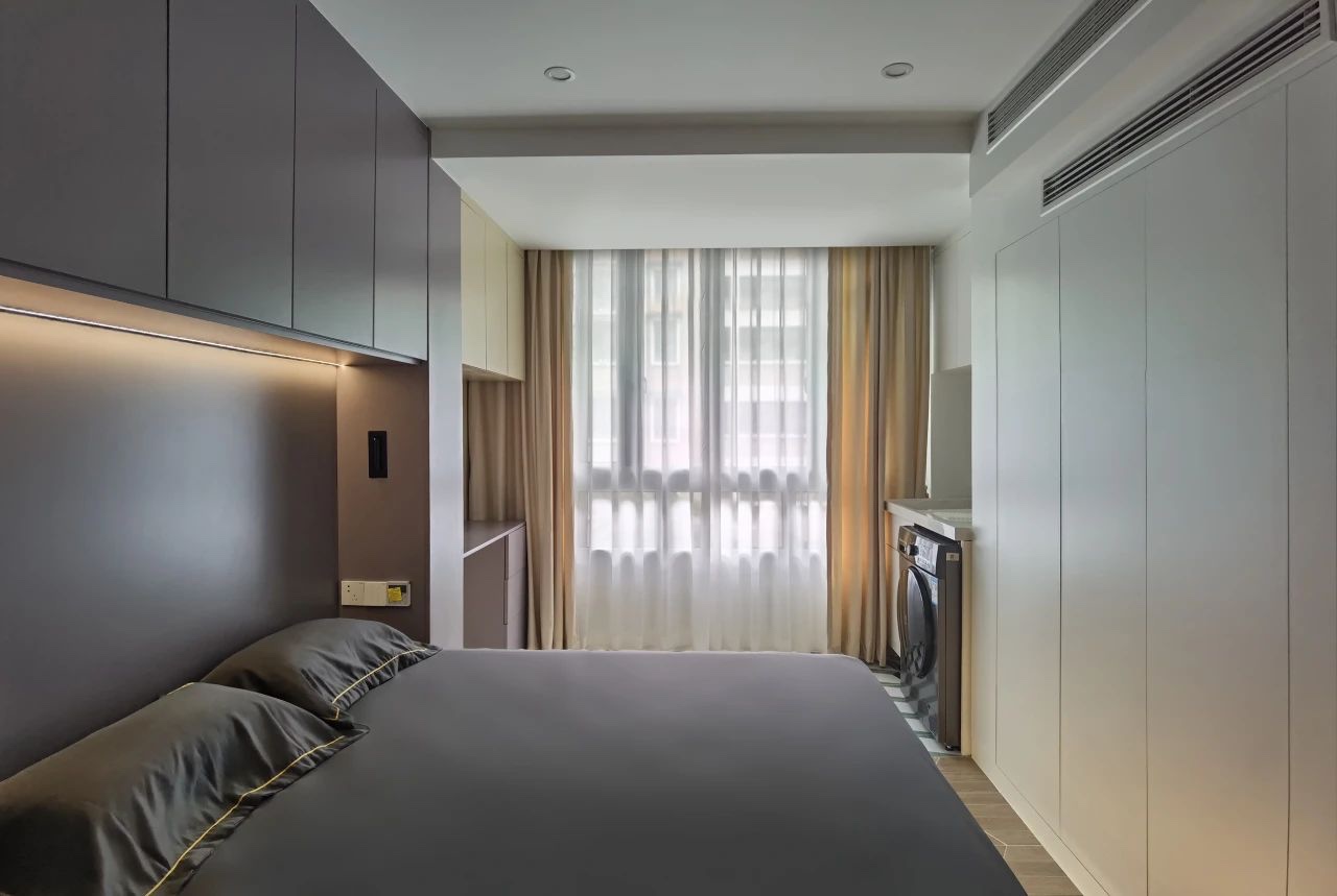 沙发对面是严丝合缝的超长定制衣柜,完善的收纳系统,保证入住后,空间依然整洁有序。
