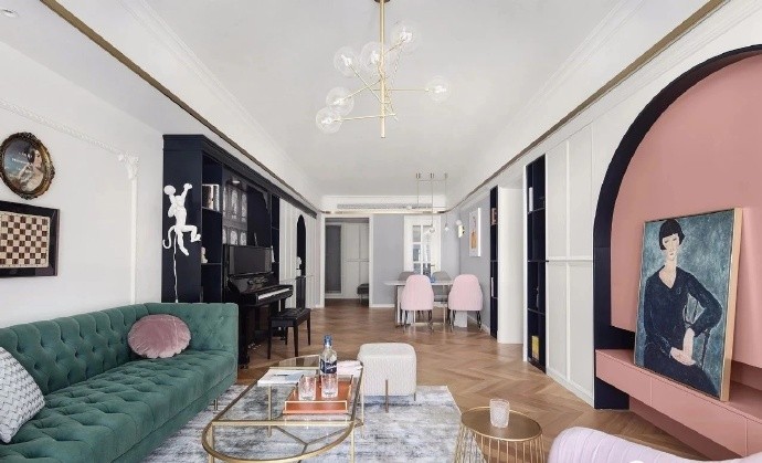 客厅整体在色彩追求时尚统一,以黑白灰为主色调,满满的现代感。客厅色彩选用灰粉,灰绿和黑色,基调统一的软装饰品,呼应整体风格。粉色单人沙发和墨绿色长沙发相搭配,看起来更加的清爽不单调,更加的灵活多变。椭圆形玻璃茶几,时尚通透又实用,整体呈现出轻奢大气之感。沙发旁边的吊顶下悬挂着一盏金色吊灯,方便生活的同时,也增加了客厅的个性和精致感。